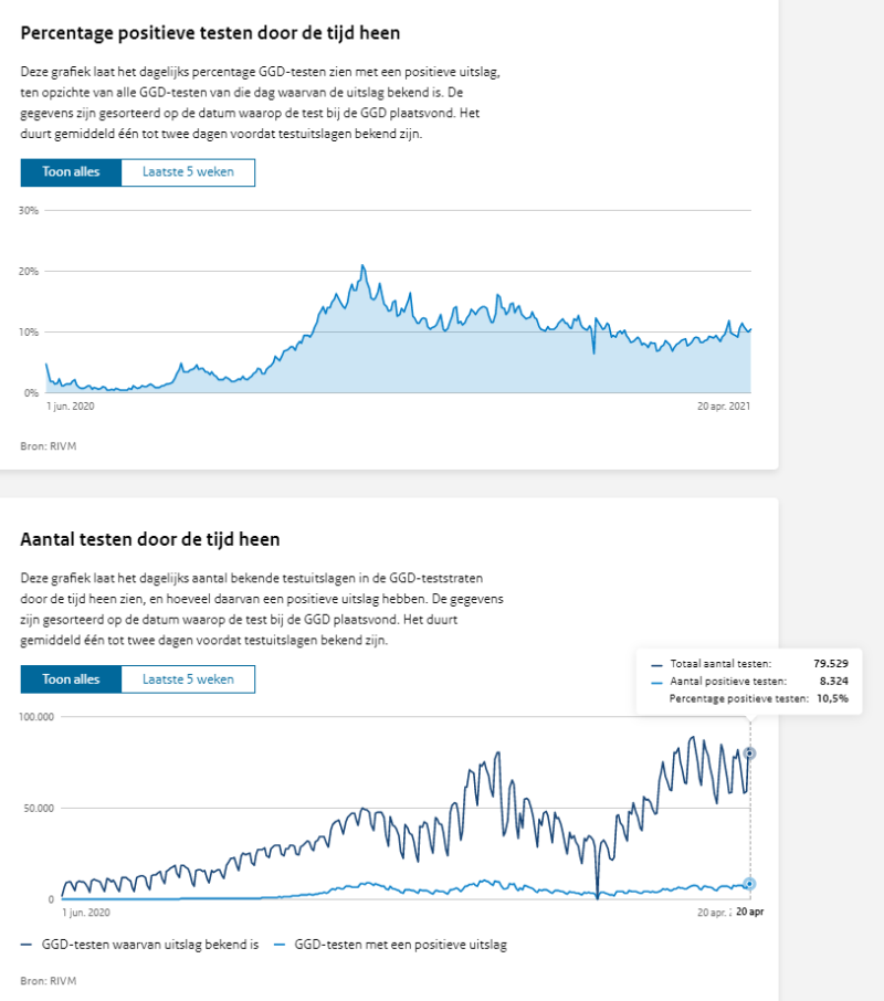 Wat heel opvallend is, is dat in de onderste grafiek de blauwe lijn het percentage positieve tests weergeeft, maar dat die lijn totaal niet overeenkomt met de bovenste grafiek, die dezelfde weergave zou moeten tonen. Let maar eens op de diepe piek in beide grafieken en het verloop daarna. In de onderste grafiek is dat een stijgende lijn, maar in de bovenste komt eerst een duidelijk dal!